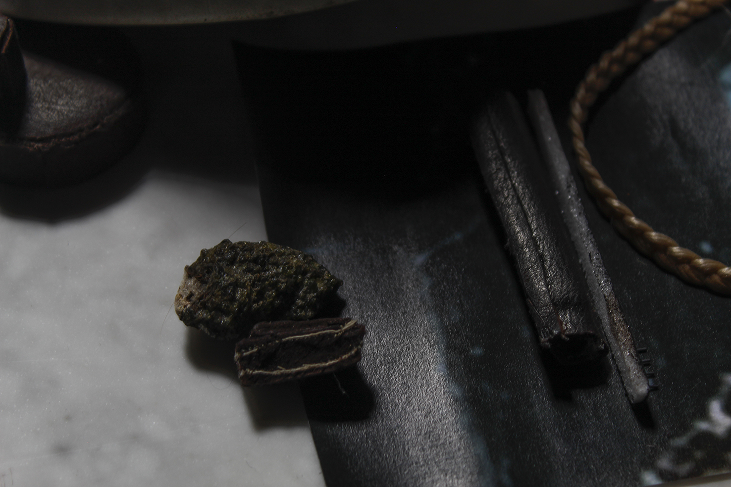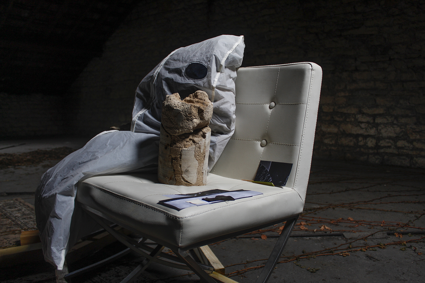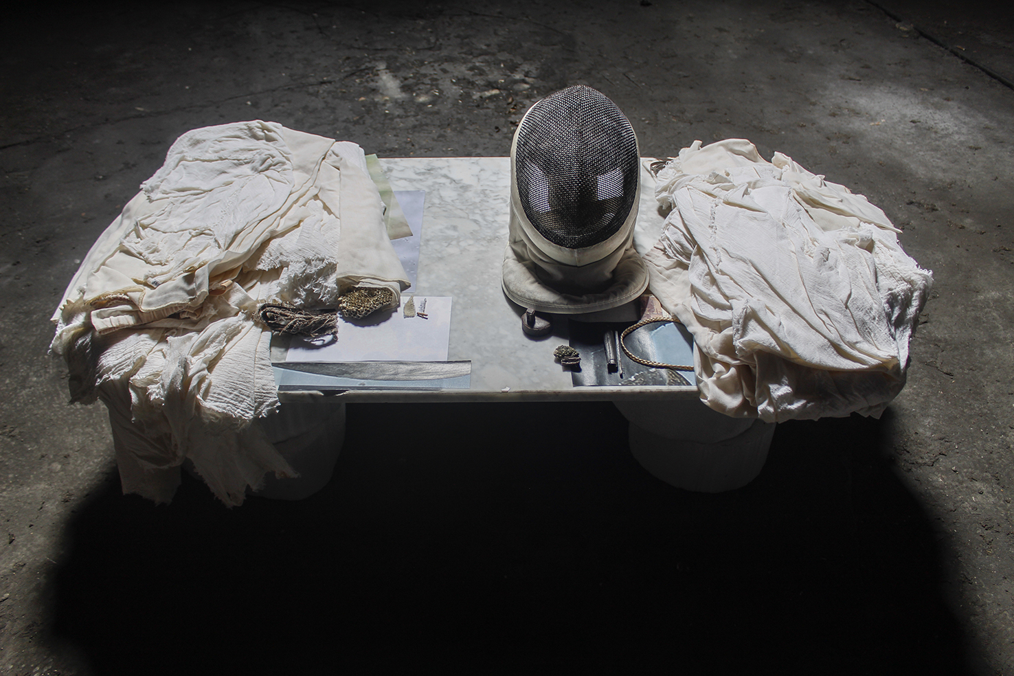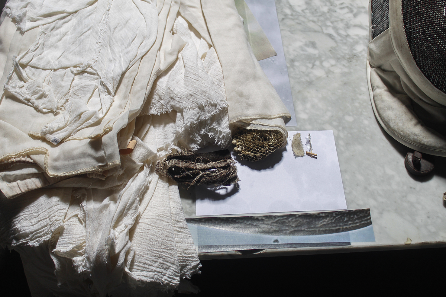 found objects, personal collection of objects, gown, grey marble, vegetal oil on printed paper, leather, wasp nest, fence equipment