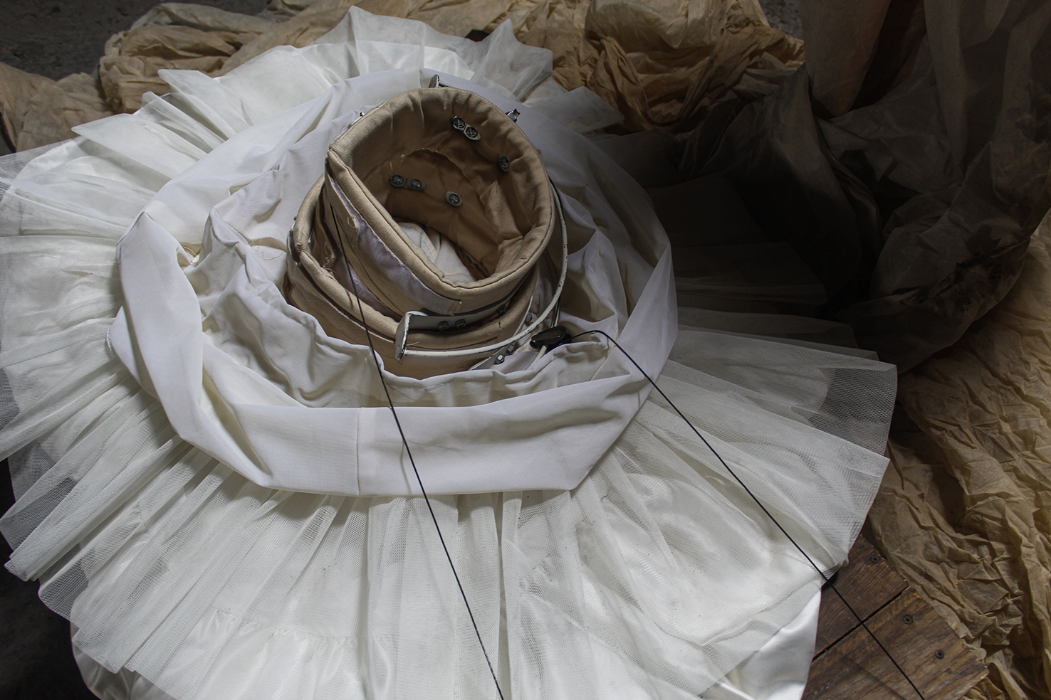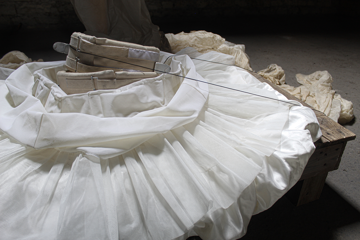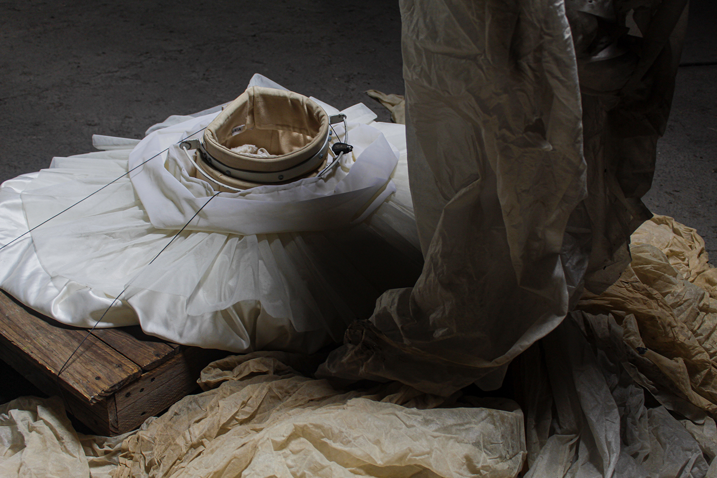 found objects, personal collection of objects, gown, grey marble, vegetal oil on printed paper, leather, wasp nest, fence equipment