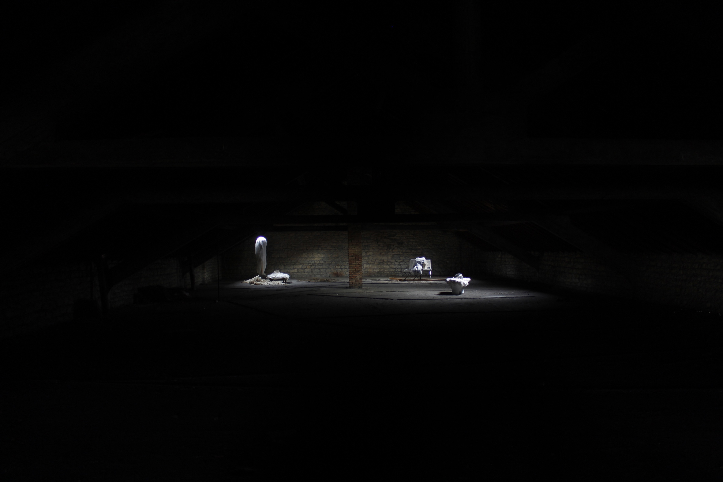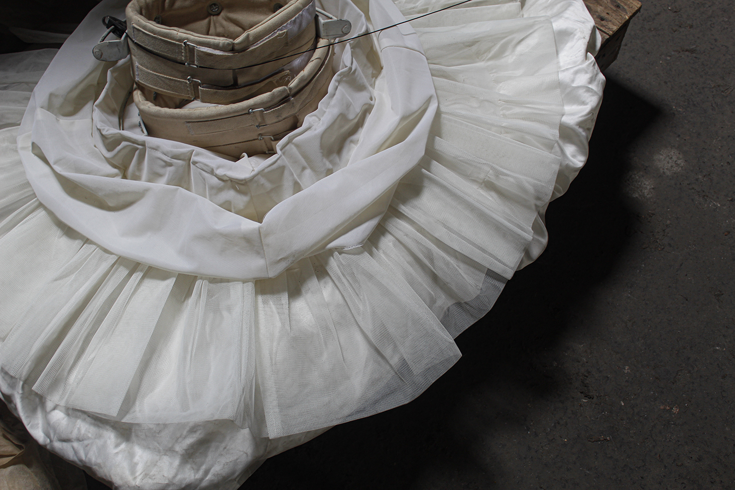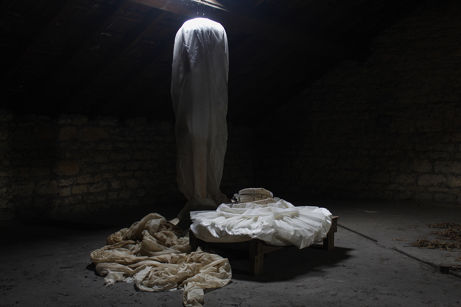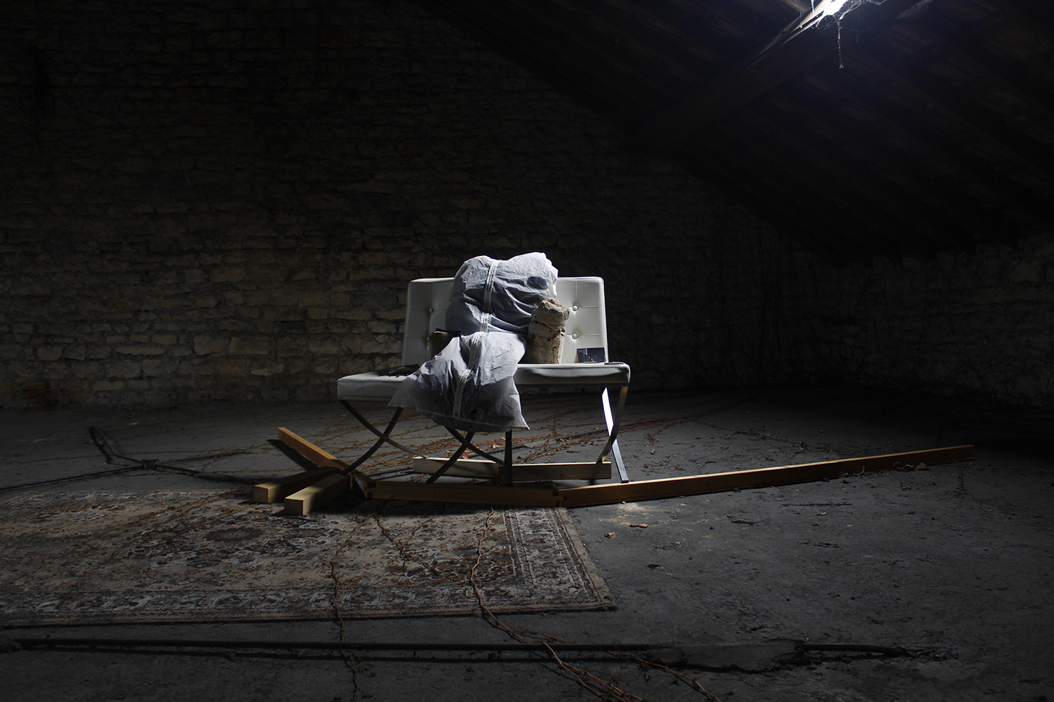found objects, personal collection of objects, gown, grey marble, vegetal oil on printed paper, leather, wasp nest, fence equipment