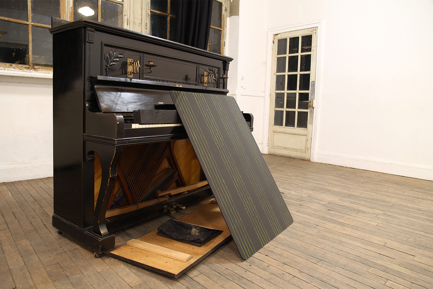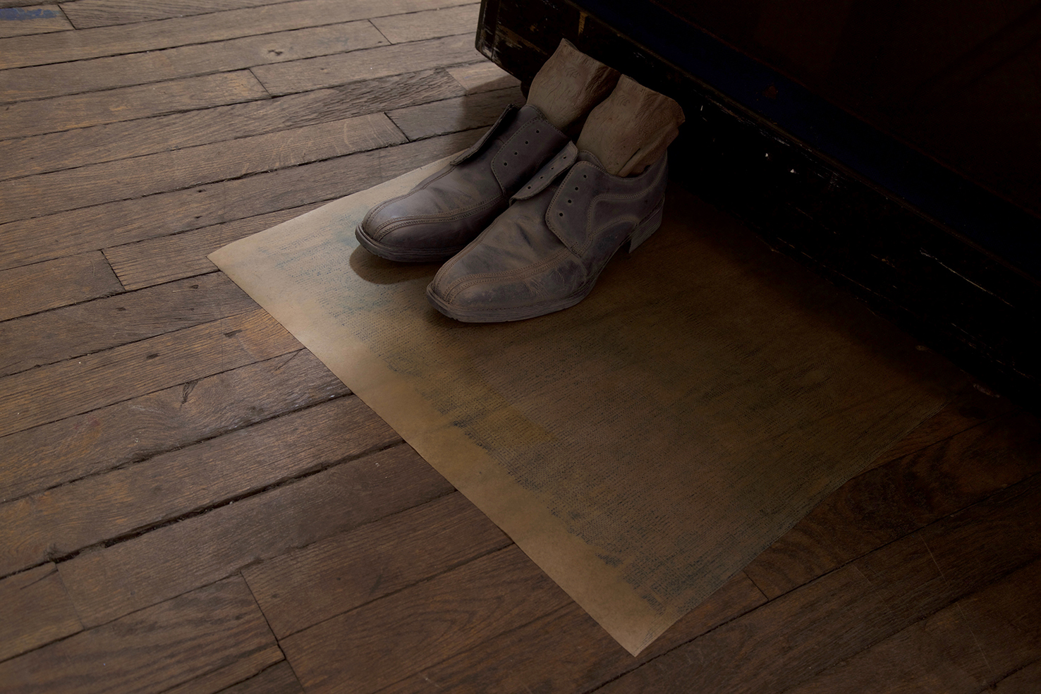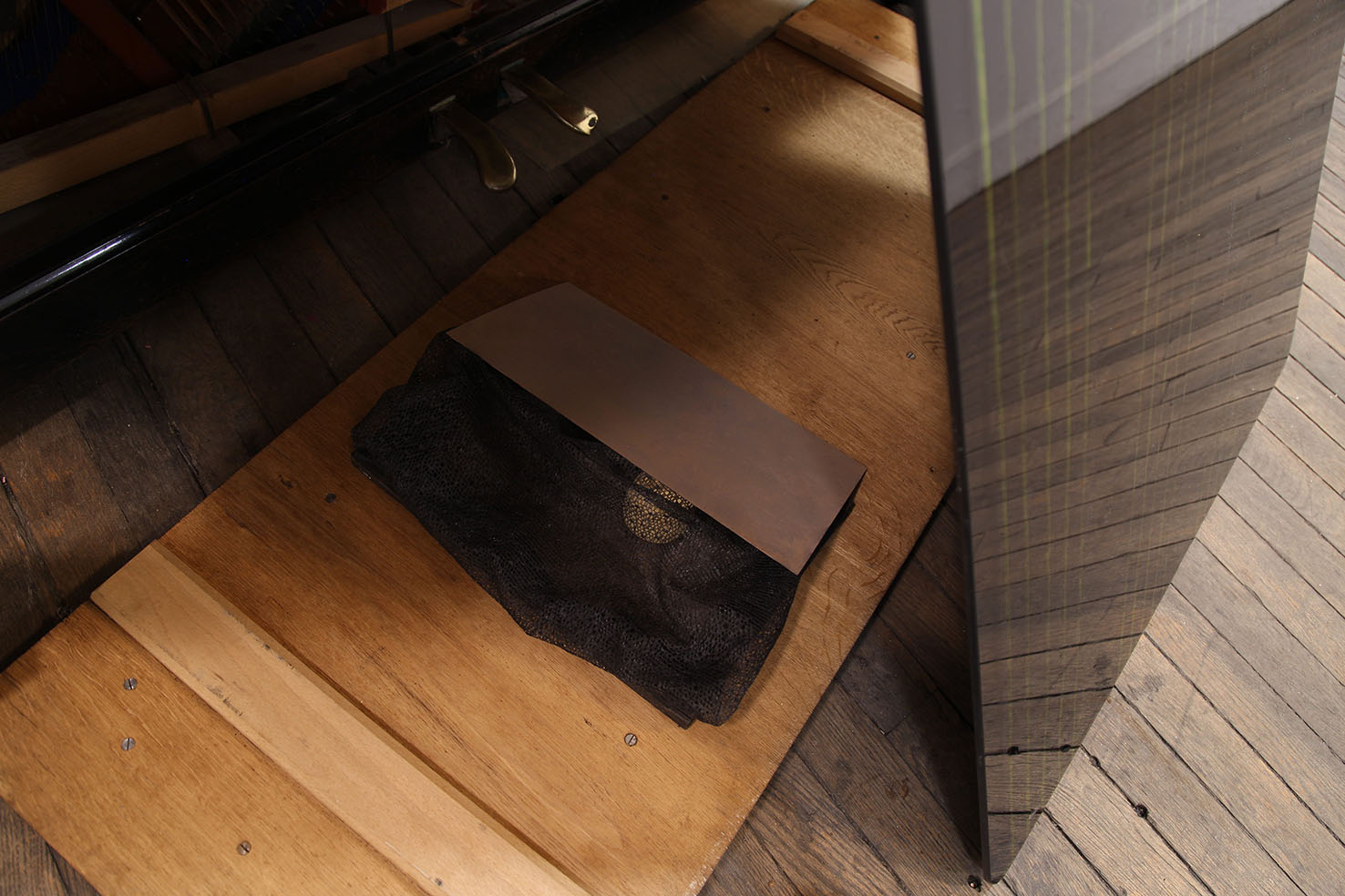 piano, found objects, mercurochrome on black glass, timber, ink on lacework, plastilina, Nyx skin foundation 'light neutral', Chanel natural finish pressed powder '30 naturel translucent 2', vegetal oil on paper, skin foundation and pressed powder on leather shoes, vegetal oil on blue frottage