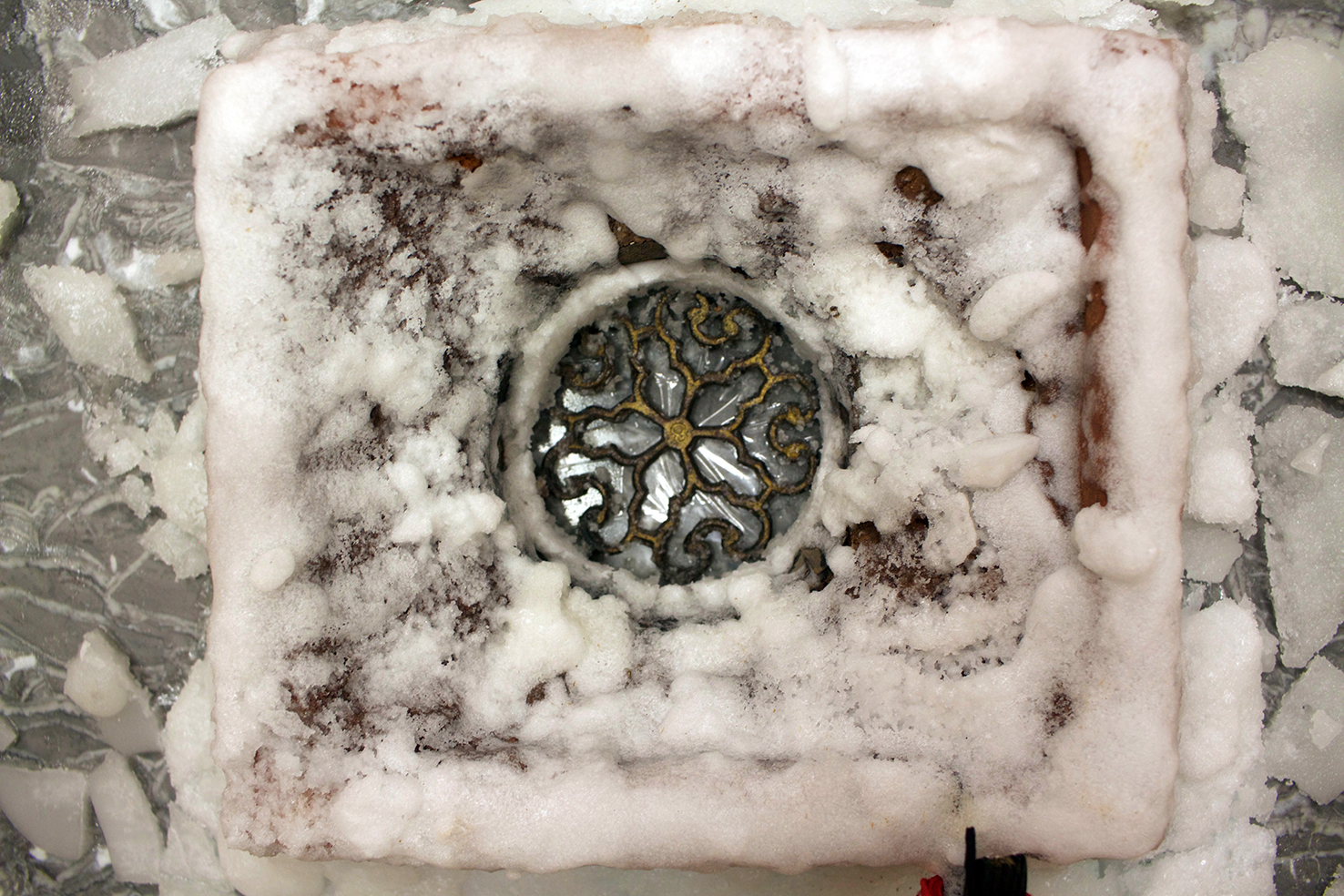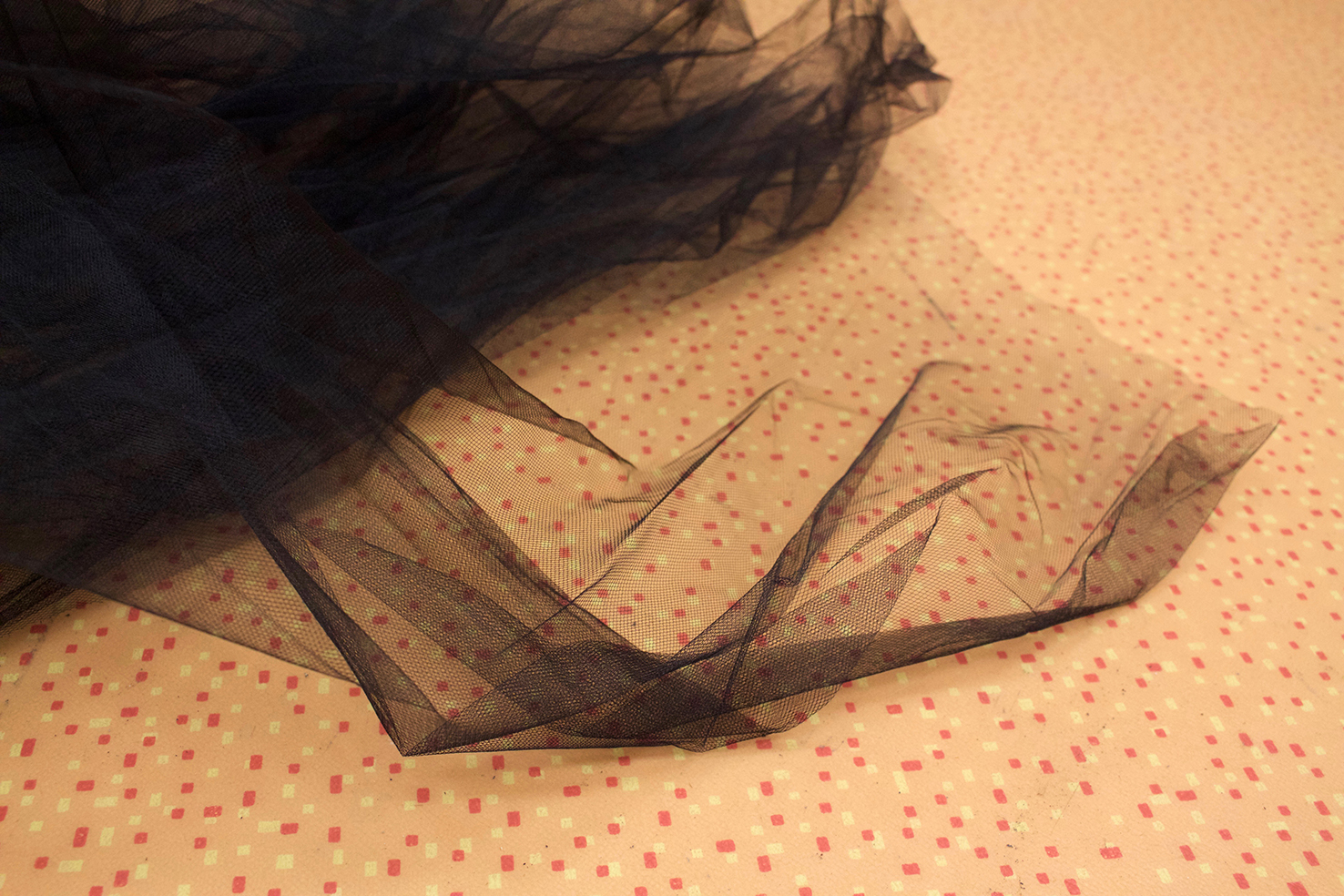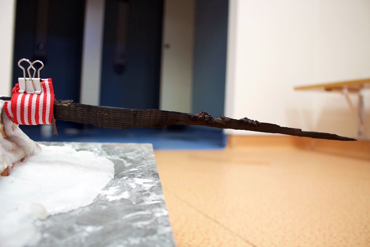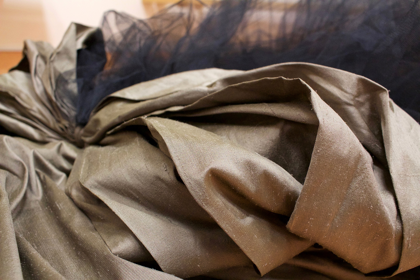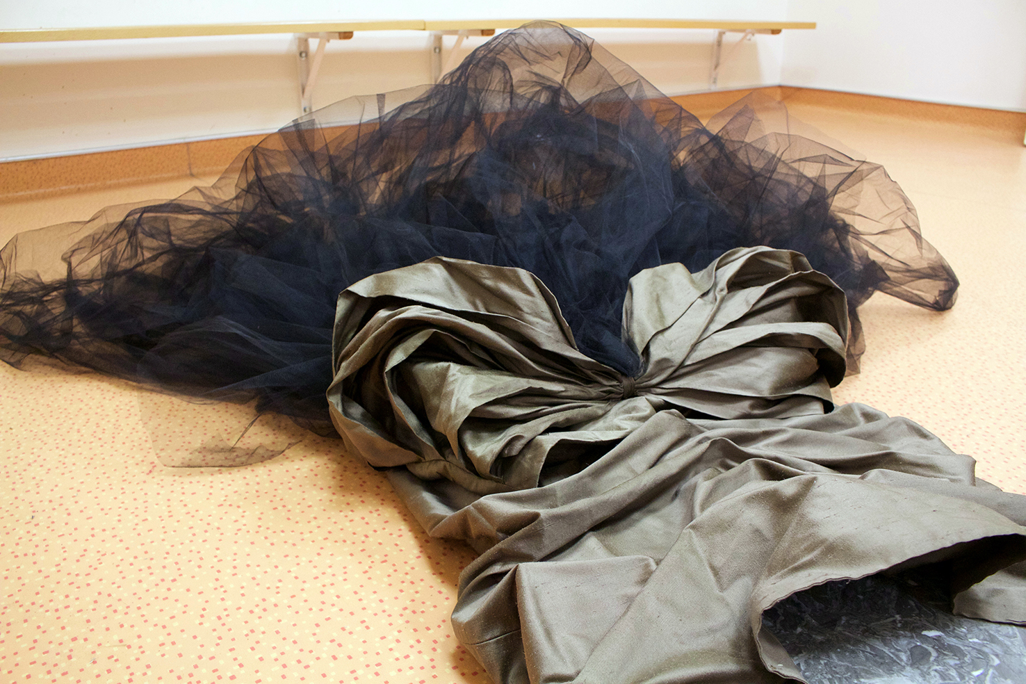 gray marble, timber, wild silk and tulle skirt, glass, sugar on ceramic, burnt wood, black paper, silicone, found objects, personal collection of objects